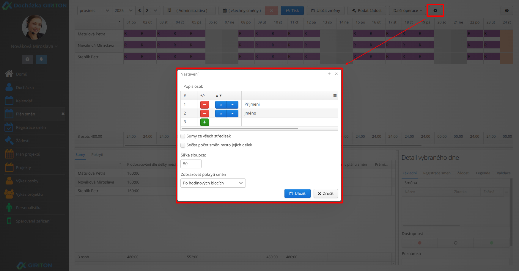 - Popis osob - zobrazí kromě jména a příjmení další údaje (např. Číslo uživatele nebo Typ pracovního poměru). Po zavření a otevření Plánu směn se v seznamu osob zobrazí požadované informace.