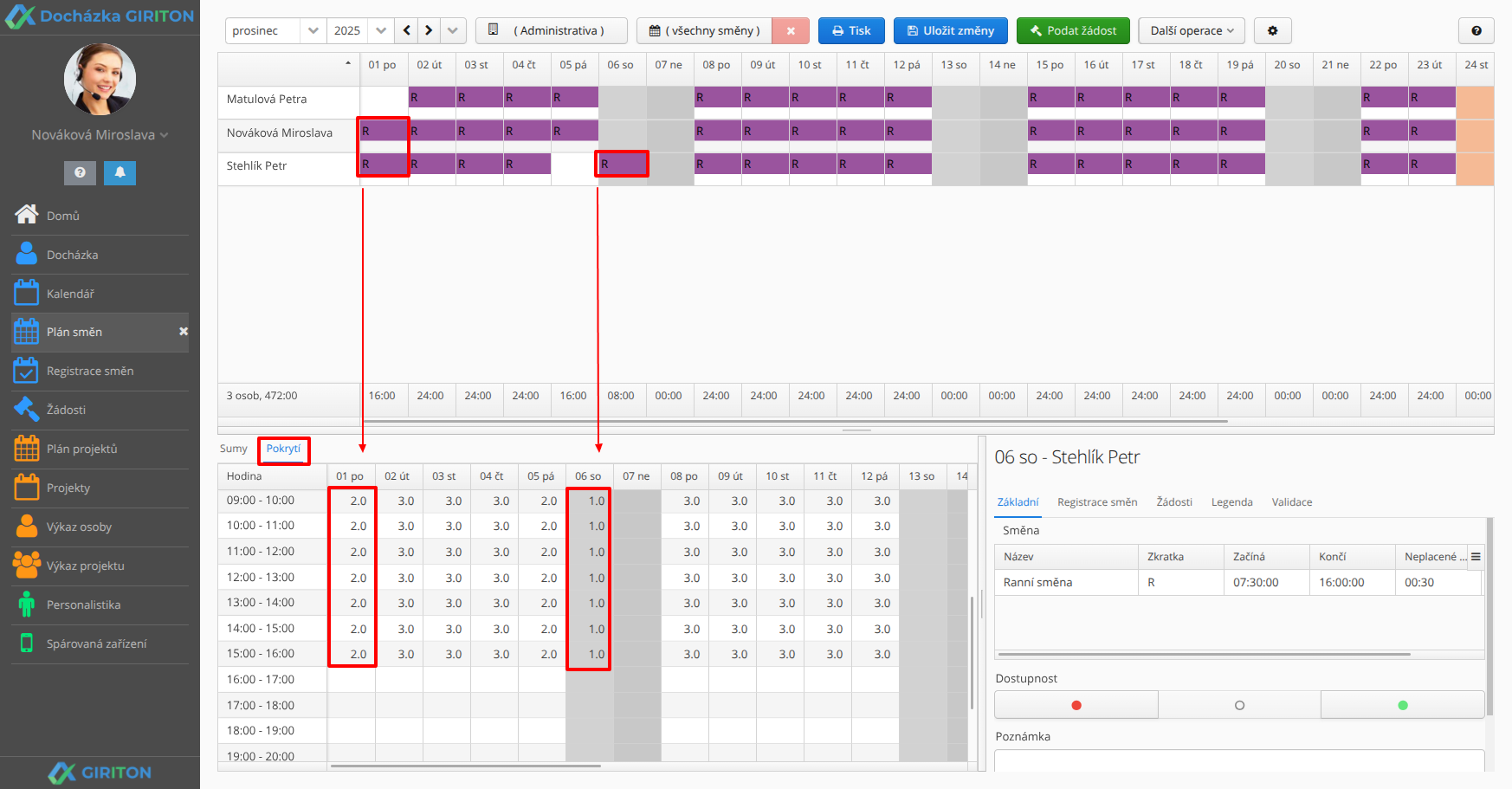 Záložka pokrytí (6) zobrazuje pokrytí směn v aktuální dny a hodiny. Dle nastavení (ikonou ozubeného kolečka) lze navolit zobrazování pokrytí směn po hodinových blocích nebo dvouhodinových blocích.