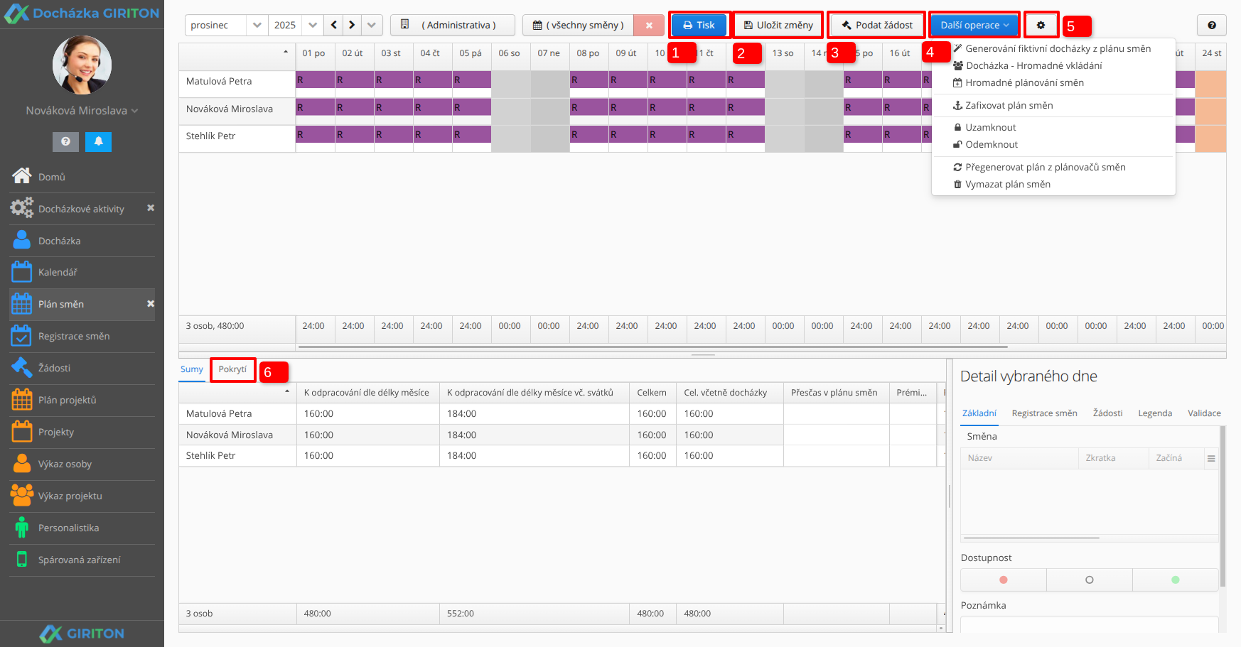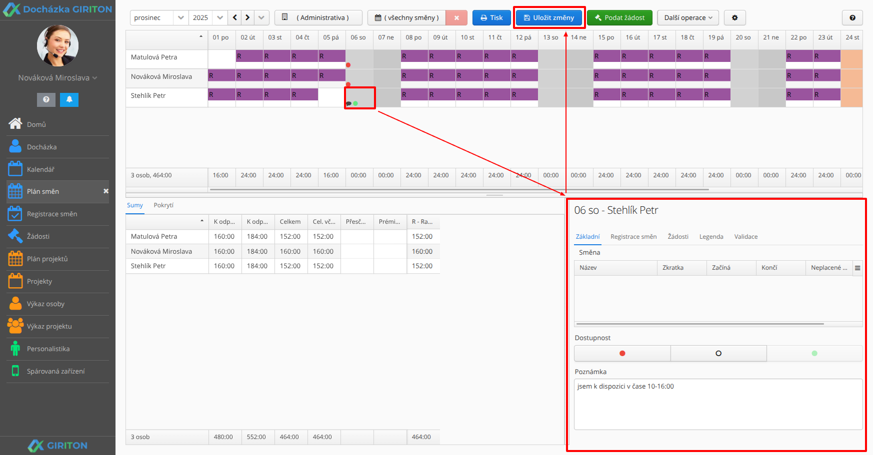 Tlačítkem Uložit změny (2) lze uložit změnu, například upravenou směnu, dostupnost nebo komentář ke konkrétnímu dni. V případě, že uživatel nemá oprávnění upravovat plán směn, nabídne se mu pouze tlačítko Podat žádost (3).