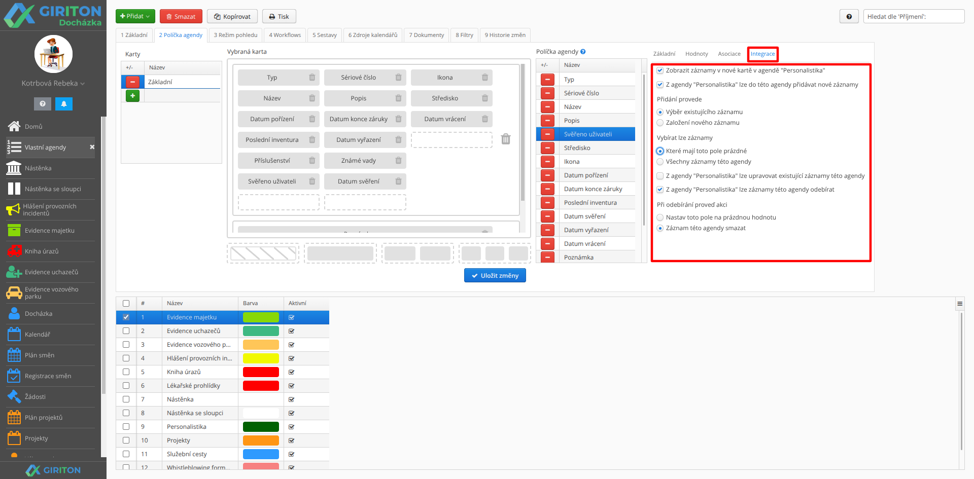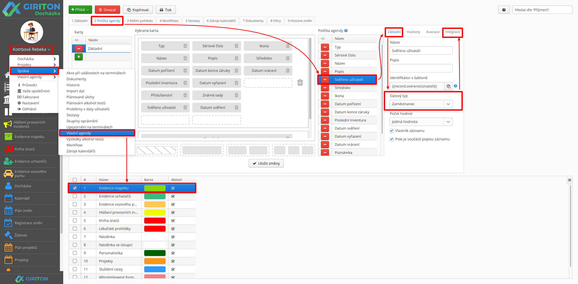 To, zda je v agendě takové pole použito zjistíte v Menu uživatel (vaše jméno vlevo nahoře) - Správa - Vlastní agendy - konkrétní agenda - na kartě Políčka agendy. Pokud má jedno z políček datový typ Zaměstnanec, lze položky integrovat.