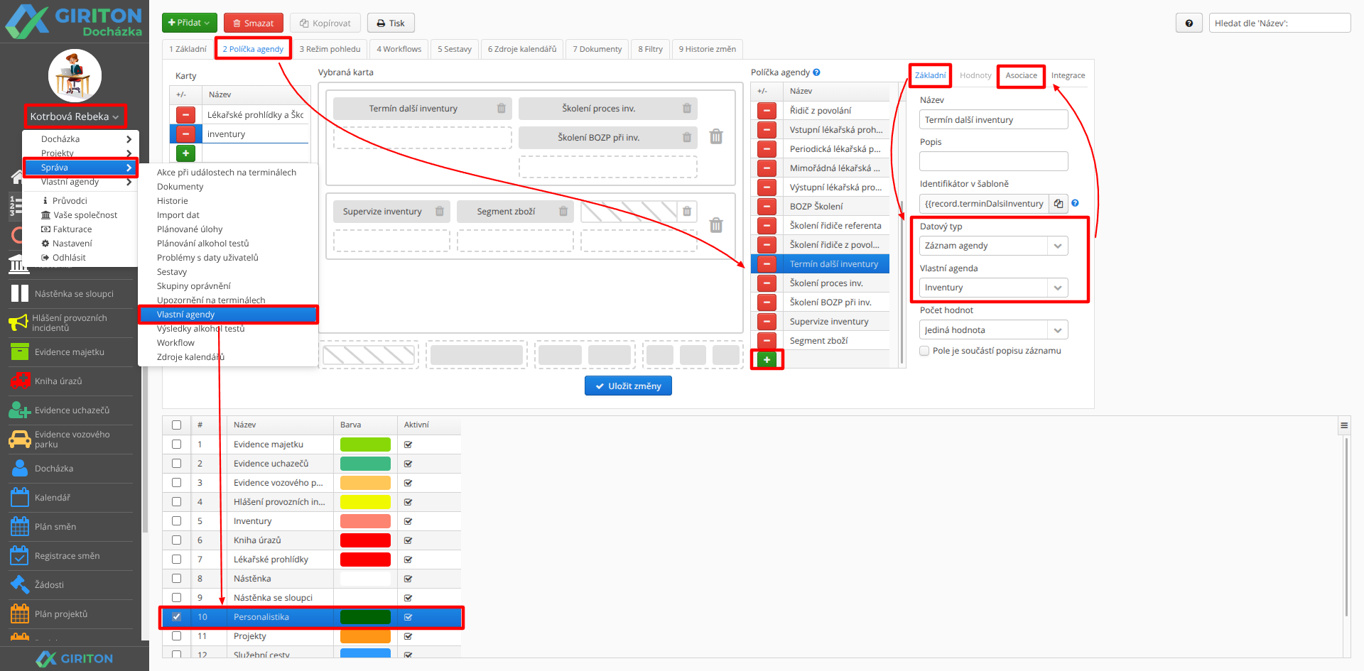 - Přejděte do Menu uživatel (vaše jméno vlevo nahoře) - Správa - Vlastní agendy - agenda Personalistika - karta Políčka agendy.