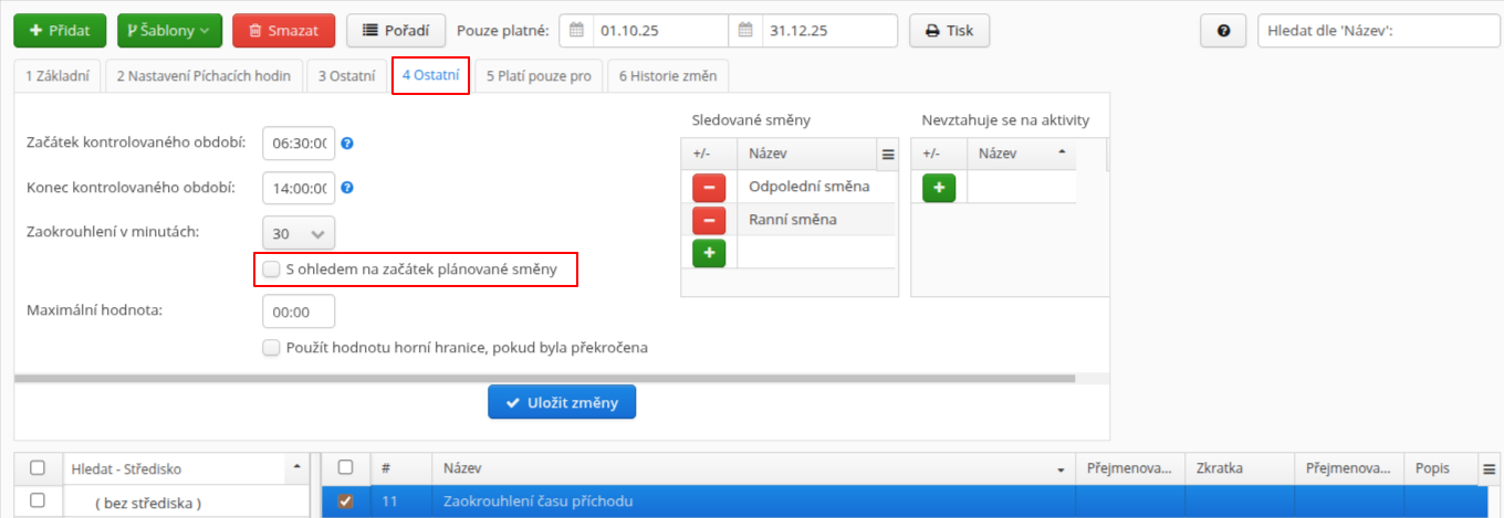 - Můžete případně upravit, že se nebude ořezávat příchod přesně na začátek směny, ale například 10 minut před jejím začátkem. Tedy pokud směna začíná v 06:00, lze sem vepsat 05:50.
